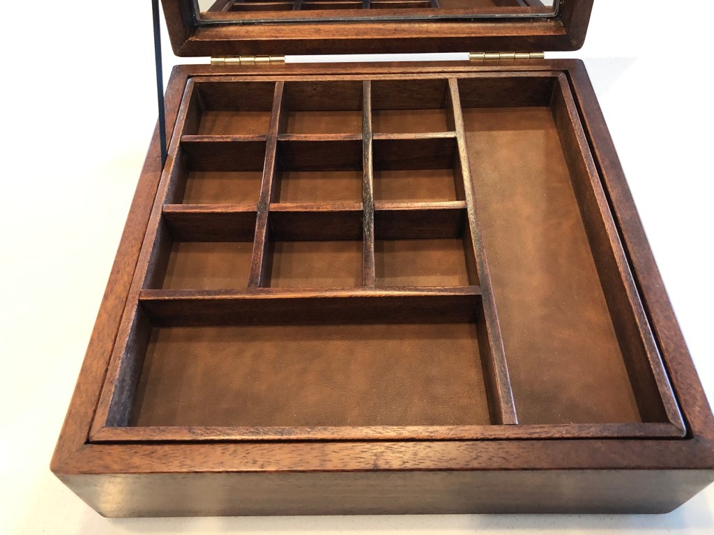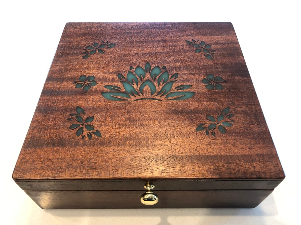 Constructed using solid mahogany and featuring a Hawaiian floral scroll saw design in the lid inlaid with turquoise powder in resin. Mirror glass was inserted inside the lid as well. Includes a large removable divider in the lower section and a lift-out tray with dividers intended for rings and watches.