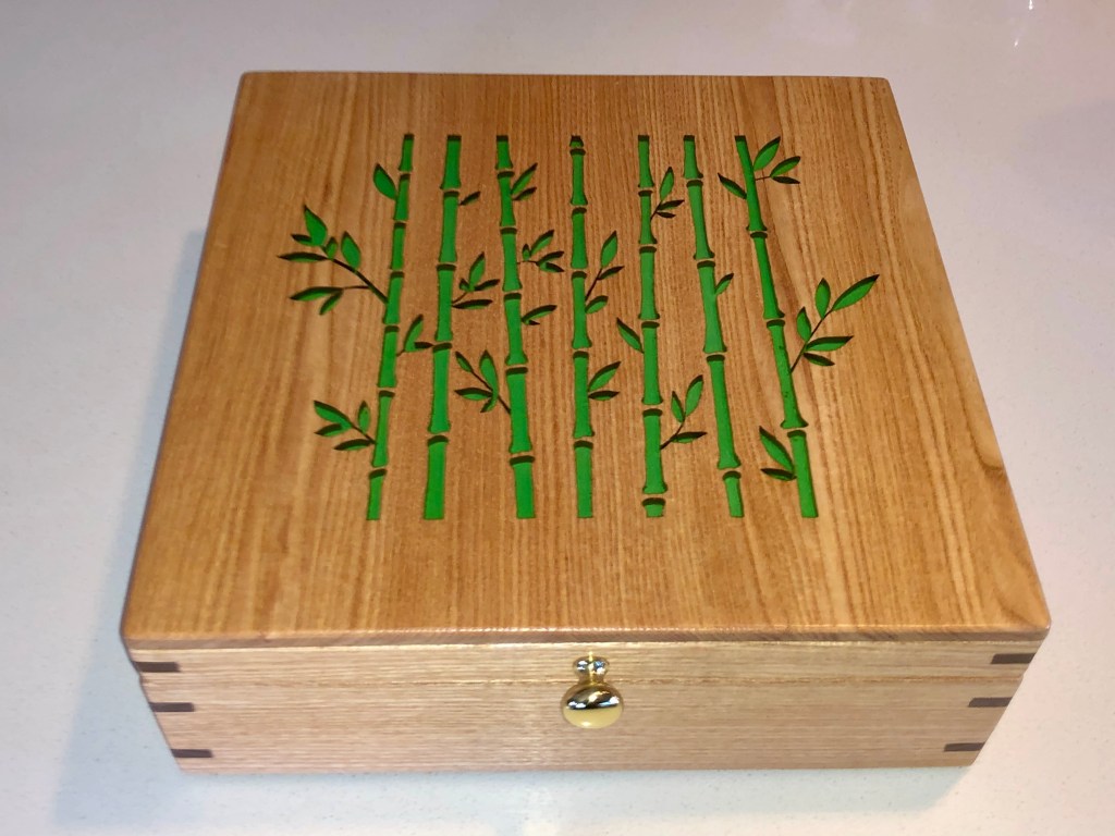 Constructed using solid coffee nut hardwood and featuring a bamboo scroll saw design in the lid inlaid with green resin. Mirror glass was inserted inside the lid as well. Includes a large removable divider in the lower section and a lift-out tray with dividers intended for rings and watches.