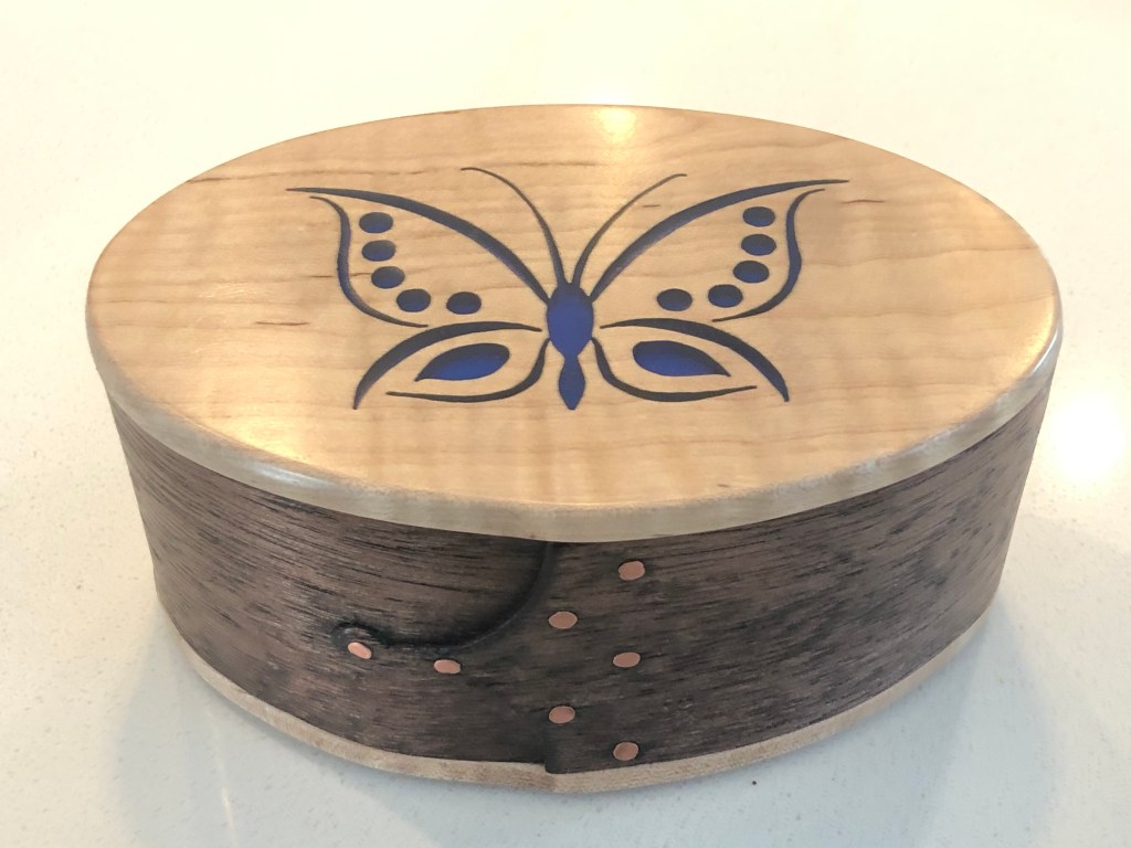 Constructed from solid hardwoods; African Mahogany body with curly maple lid and base. Inlaid with blue resin.