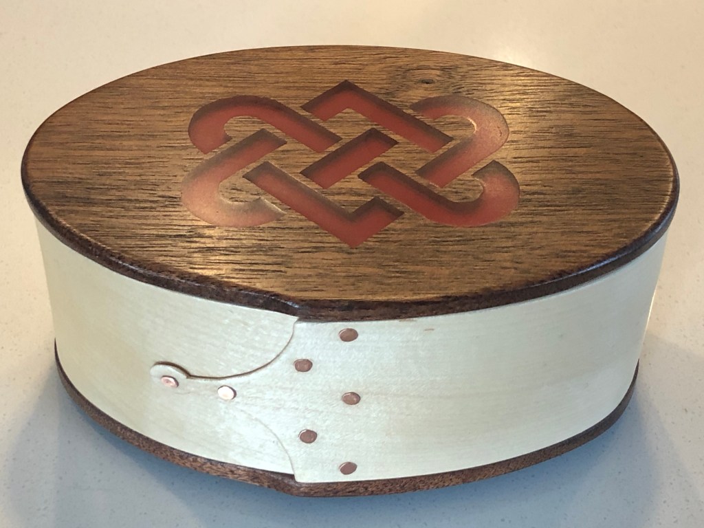 Constructed from solid hardwoods; basswood body with African mahogany lid and base. Inlaid with red resin.