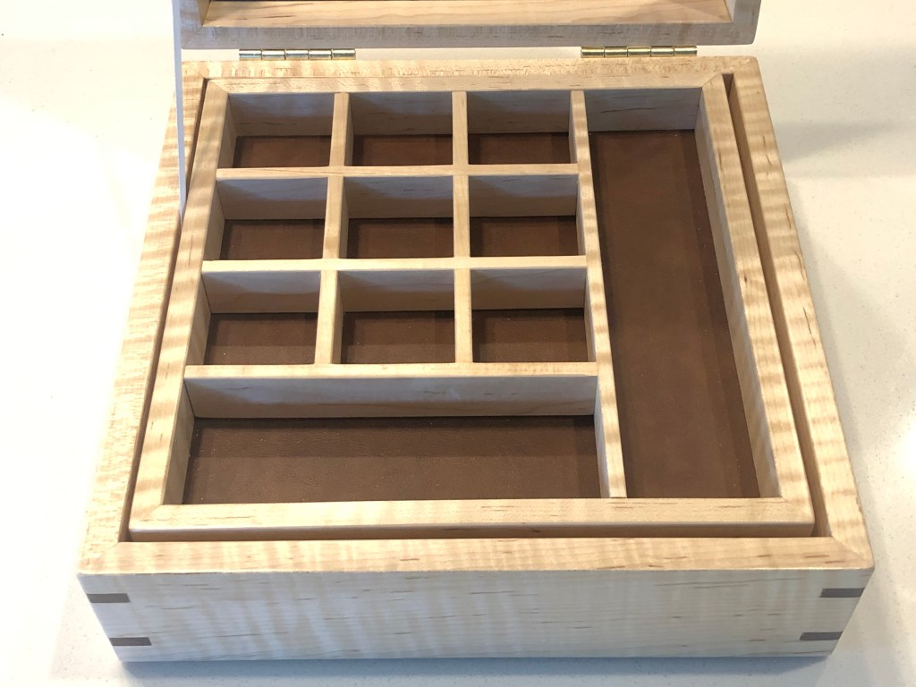Constructed using solid curly maple and featuring a scroll saw design in the lid inlaid with dark brown resin. Mirror glass was inserted inside the lid as well. Includes a large removable divider in the lower section and a lift-out tray with dividers intended for rings and watches.