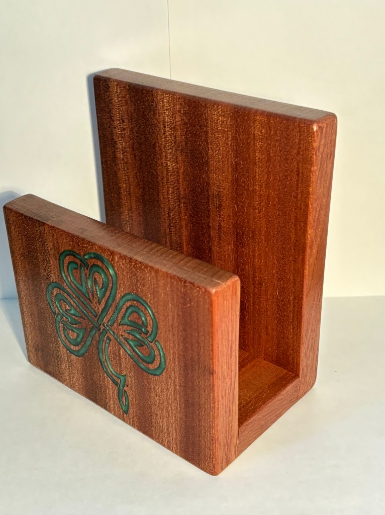 Constructed using solid African sapele mahogany and featuring an inlaid modern shamrock design using sparkling green resin.
