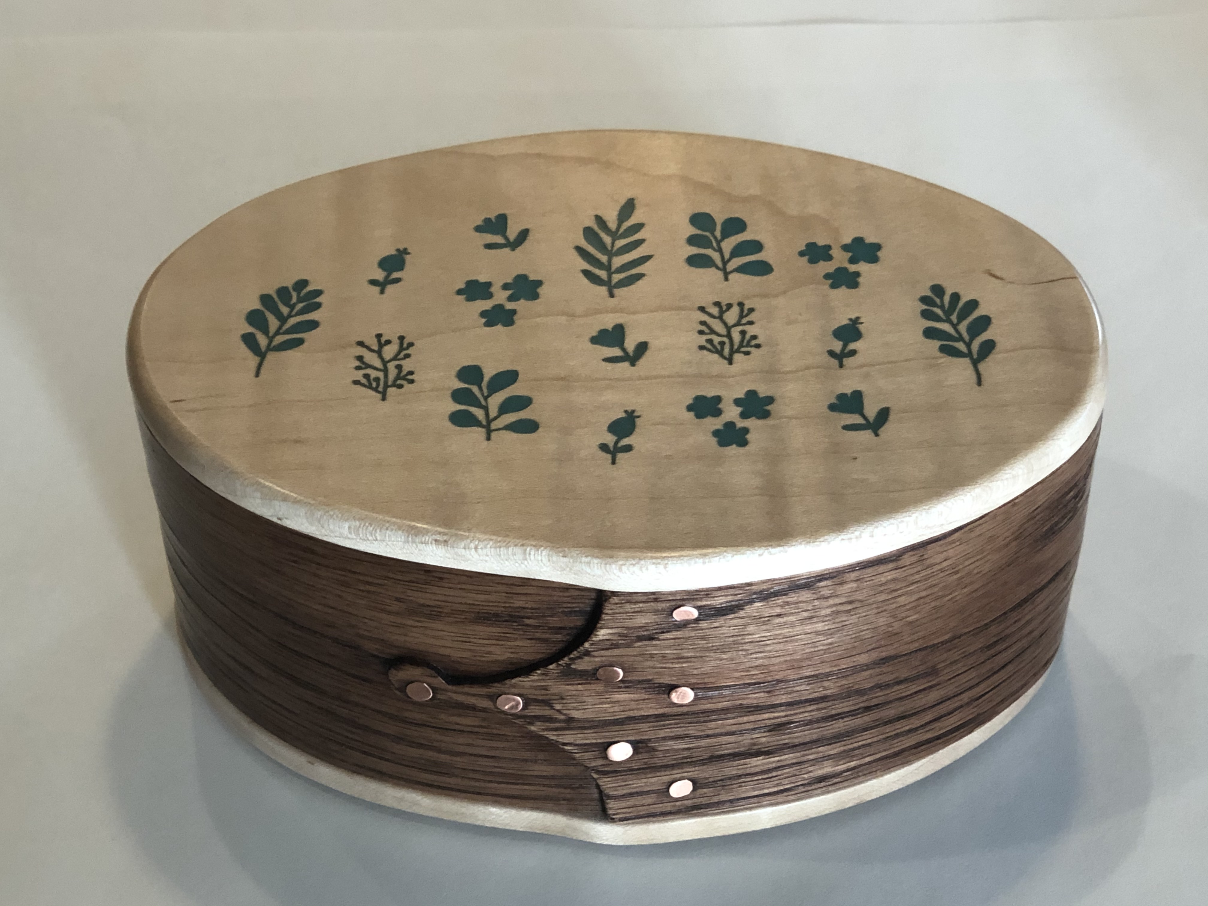 Constructed from solid hardwoods; red oak body with curly maple lid and base. Inlaid with powdered turquoise in resin.