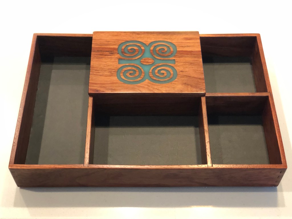 Constructed using solid bubinga wood with a black lining in faux leather. Features an inlaid lid (African symbol for “Humility with Strength”) with turquoise in resin. Valet also includes a removable divider within the lid section.