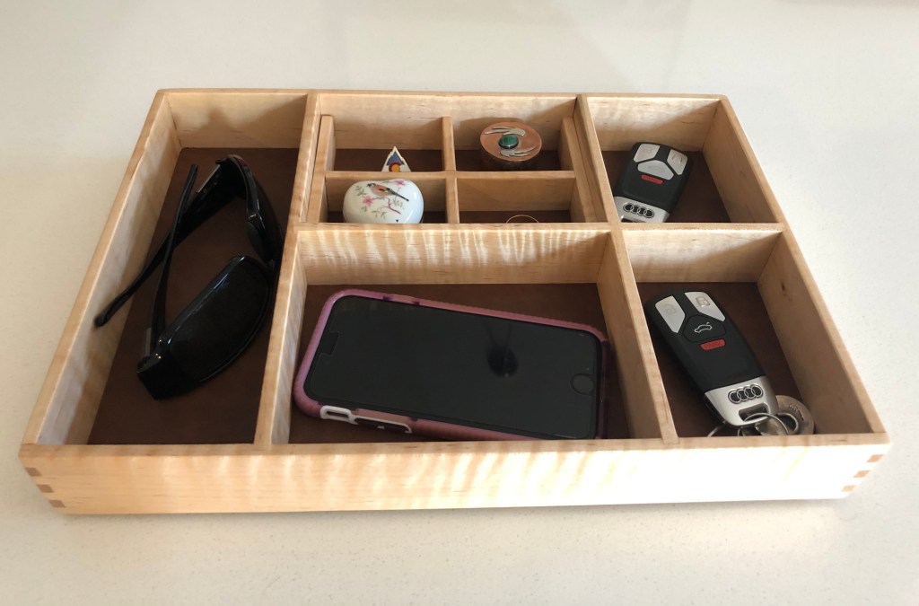 Constructed using solid curly maple with a brown lining in faux leather. Features an inlaid lid (butterfly) with dark bronze resin. Valet also includes a removable divider within the lid section. Size: 13.5″ W X 9.5″ D X 2″ T