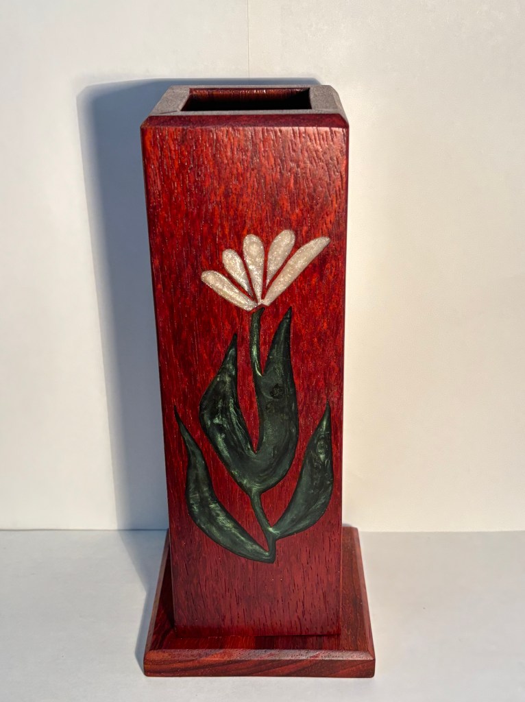 Constructed from solid African Padauk and featuring an inlaid modern floral scroll saw design using sparkling silver and dark green resin.
