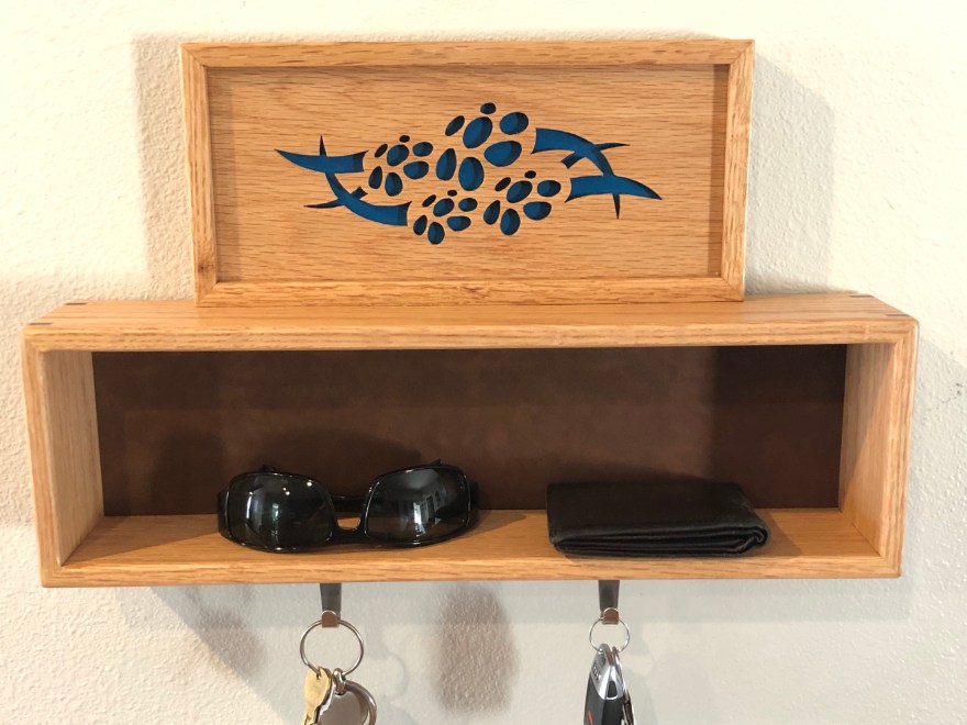 Constructed using solid red oak with a brown faux leather lining within the cubby. Features a Hawaiian floral design with a blue fabric background. Size: 18”W X 3.5”D X 11”T.