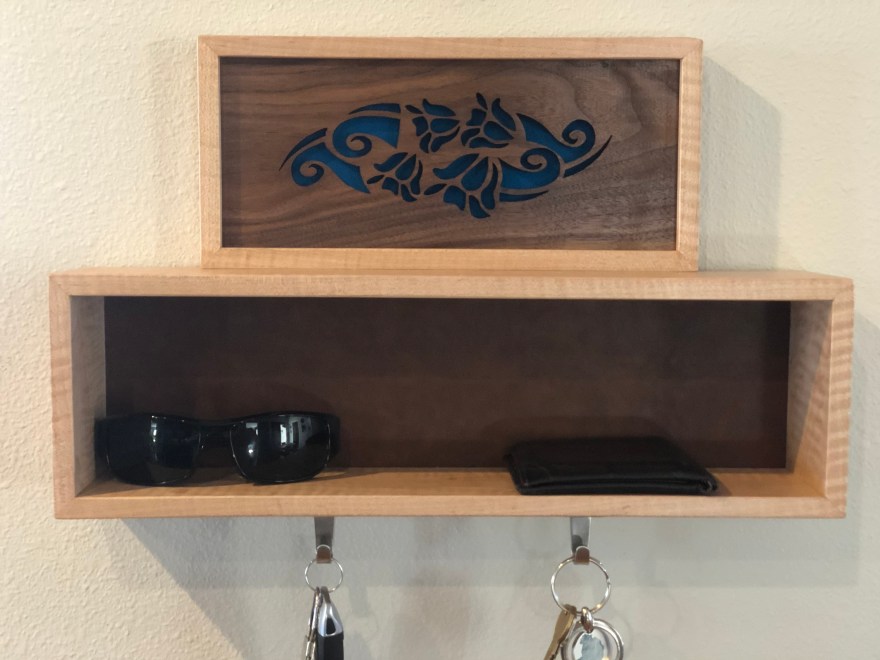 Constructed using solid curly maple and walnut with a brown faux leather lining within the cubby. Features a Hawaiian floral design with a blue fabric background. Size: 18”W X 3.5”D X 11”T.
